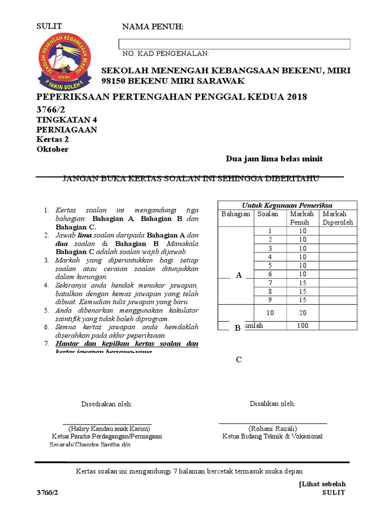 Perniagaan K2 Soalan Percubaan Miri Sarawak 2018 Jawapan Docx Smk Riam Miri Peperiksaan Percubaan Iii Ogos 2018 Perniagaan Kertas 2 3766 2 2 Jam Course Hero